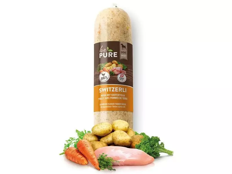 Die Switzerli mit Huhn und Kartoffeln von bePure werden in der Schweiz hergestellt und enthalten zu 100% Schweizer Fleisch und sind glutenfrei. Die Wurst verfügt über einen hohen Fleischanteil und kann als Snack oder Alleinfuttermittel gefüttert werden.