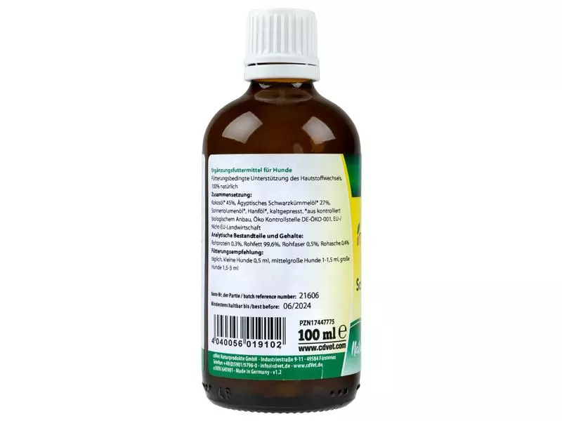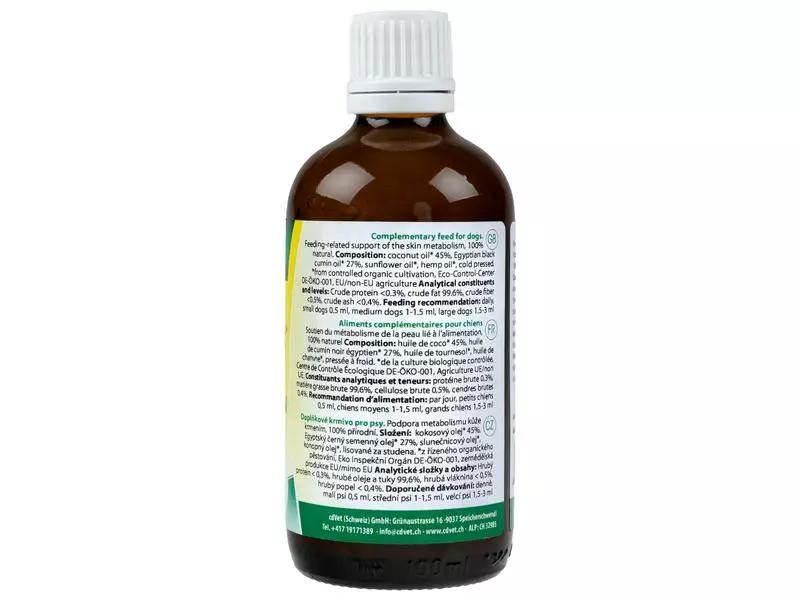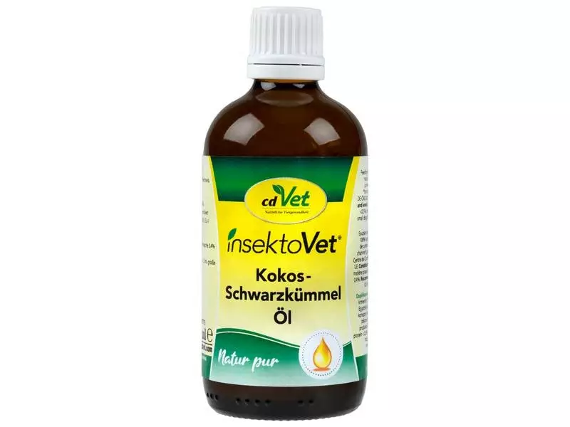 Im insektoVet Kokos-Schwarzkümmel-Öl vereinen sich zwei Klassiker – Bio-Schwarzkümmelöl und Bio-Kokosöl. Die darin enthaltenen essentiellen Fettsäuren in Kombination mit Laurinsäure und ätherischen Ölen aus Schwarzkümmel können den Hautstoffwechsel optimieren und Einfluss auf den Körpergeruch des Tieres nehmen. In zellbiologischen Studien konnte gezeigt werden, dass die Widerstandkraft der Hautzellen ganzjährig durch insektoVet Kokos-Schwarzkümmel-Öl gestärkt werden kann. Insbesondere wird die Barrierefunktion der Hautzellen gestärkt, die auch eine wichtige Bedeutung für die natürliche Regenerationskraft der Haut hat. Durch die darmpflegenden Inhaltsstoffe wird die Darmflora in Ihrem Gleichgewicht unterstützt, und die Ansiedlung von Darmparasiten erschwert. insektoVet Kokos-Schwarzkümmel-Öl empfiehlt sich zur Fütterung und für die Haut und Fellpflege.