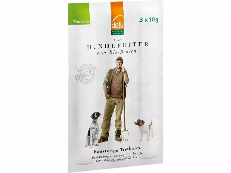 Die Defu Bio-Kaustangen sind leckere Belohnungs-Snacks, die Sie Ihrem Hund gerne zwischendurch geben können. Truthahn, Leinsamen, Rosmarin und Sanddorn stammen aus biologischer Erzeugung. Ein bisschen Gelatine und Meersalz sind noch drin – mehr nicht. Auf Zucker, Konservierungsmittel und künstliche Farb- oder Geschmacksstoffe wird vollständig verzichtet.