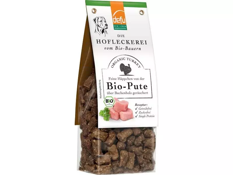 Die Defu Hofleckereien von der Bio-Pute bestehen aus 96.5% Putenfleisch und werden in der Räucherkammer mild über reinem Buchenholz geräuchert und veredelt. Sie sind getreidefrei, zuckerfrei, Single Protein und besonders bekömmlich. Die Hofleckereien eignen sich hervorragend als gesunder und wesensgerechter Snack oder als kleine Belohnung zwischendurch. Sie sind frei von jeglichen Zusatzstoffen, hoch verdaulich und damit auch für sensible und ernährungsempfindliche Tiere mit Allergien und Unverträglichkeiten als gesunde Ergänzung der täglichen Nahrung geeignet. Die Häppchenform eignet sich ideal als Trainingsleckerli für unterwegs oder auch als präzise, schnelle Belohnung auf dem Hundeplatz.