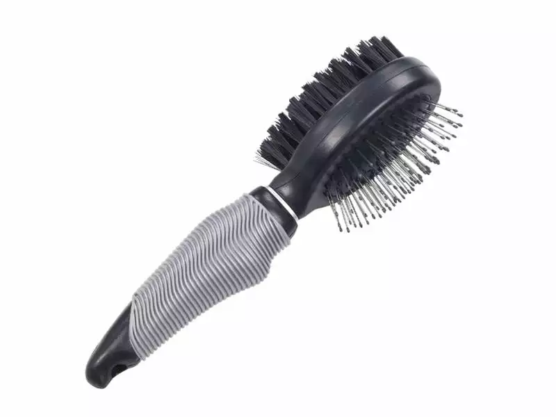 Die Pflegeserie «Starline» zeichnet sich durch seinen ergonomischen Softgriff aus. Die Anwendung wird dadurch optimiert und ist angenehm für Mensch und Tier. Das übersichtliche Sortiment ist aufgeteilt in vier Anwendungskategorien. Die «Bürste doppelt» gehört zur Kategorie «Glanz und Massage» und ist auf einer Seite mit einer Stahlbürste ausgestattet. Hierbei sind die Borsten mit einem Kunststoffschutz versehen. Bei der Anwendung wird die Haut massiert und die Durchblutung gefördert. Bei Nutzung der zweiten Seite sorgen Nylonborsten für ein gepflegtes und glänzendes Fell. Dieser Artikel ist sowohl für Katzen als auch für Hunde geeignet.