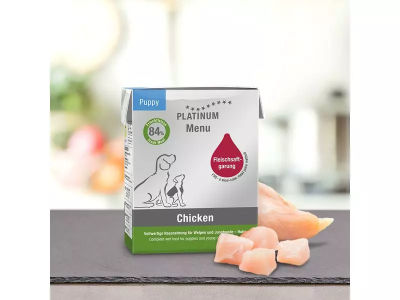 Die Nassnahrung von Platinum wird durch Fleischsaftgarung zubereitet. Fleischsaftgarung ist eine besondere Zubereitungsart von Frischfleisch, die in der Küche entstanden ist, nicht in der Futtermittelindustrie. Vorbild waren Techniken, die Spitzenköche oft verwenden, um Fleisch durch den Fleischsaft schmackhafter und auch gesünder zuzubereiten. Die Fleischsaftgarung ist eine ausgewählte Kombination dieser Zubereitungstechniken, angepasst an die körperlichen Bedürfnisse und Interessen des Hundes. Bei der Fleischsaftgarung wird Frischfleisch, wie in der Küche, nur im eigenen nähstoffreichen Fleischsaft gegart.