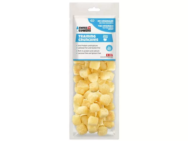 Herzhaft knusprige Käse Crunchies aus 100% Schweizer Milch mit viel Protein und Kalzium. Der gesunde Snack fürs tägliche Training oder als Belohnung zwischendurch. Fütterungshinweis: ab 3 Monaten, nur unter Aufsicht verfüttern und genügend frisches Wasser bereitstellen.