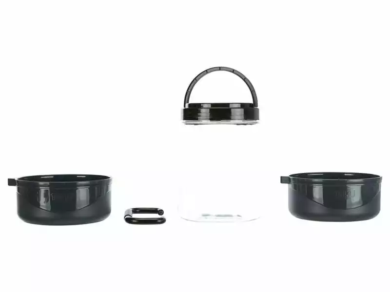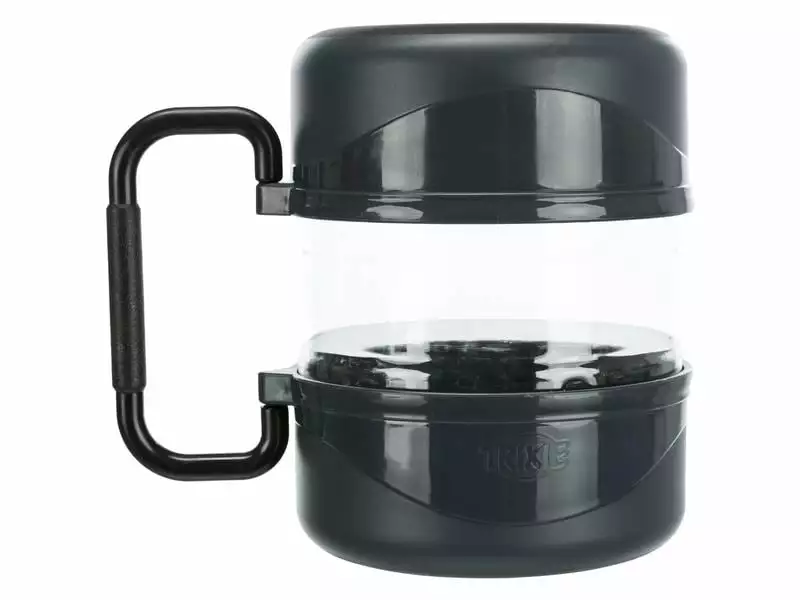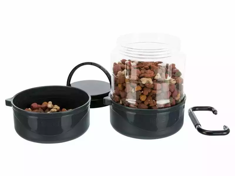 Dieses Reise-Set eignet sich für den Transport von Trockenfutter und ist ideal für Road-Trips übers Wochenende oder für anstrengende Wanderungen mit Ihrem Hund. Die zwei Futternäpfe verfügen über rutschfeste Gummiböden und fassen beide 0,75 Liter. Der transparente Plastikcontainer fasst 2 Liter und ermöglicht den sauberen Transport von Trockenfutter oder Leckerlis. Die Näpfe und der Container lassen sich platzsparend zusammenstecken und mit einem Handgriff befestigen.